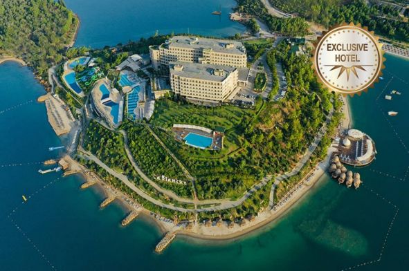 La Blanche Island се намира в уединен и много красив район на крайбрежието на Гюверджинлик с обща площ от 82 000 m². Включва собствена пясъчна ивица от общо 1200 м, и aква парк. Летище Милас Бодрум е на 15 км. Пред хотела има спирка за градски транспорт. Реновация през 2023/4 г на ресторантите, общите части и подобрена Ultra All Inclusive концепция.