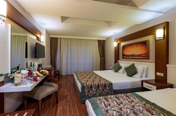 Кемер, където планината Тавър се среща с тюркоазения цвят на Средиземно море, е в центъра; С цел предоставяне на всички видове услуги, от които се нуждаете на почивка с истинско качество; Нашият "ALL INCLUSIVE" хотел ви очаква, нашите скъпи гости, с великолепната си гледка към планината, украсена със зеленина, заедно с уникалното си слънце и плаж.